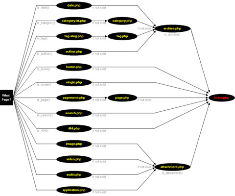 อธิบายคร่าวๆ ก็คือ เวลาออกแบบเว็บแต่ละหน้าหรือแต่ละชุด ให้ตั้งชื่อไฟล์ให้เหมาะสม เวิร์ดเพรสจะวิ่งไปหาไฟล์แต่ละไฟล์ตามรูปนี้ หากหาไม่เจอ มันก็จะแสดงหน้าตาแบบบ้านๆ (index.php) มาให้